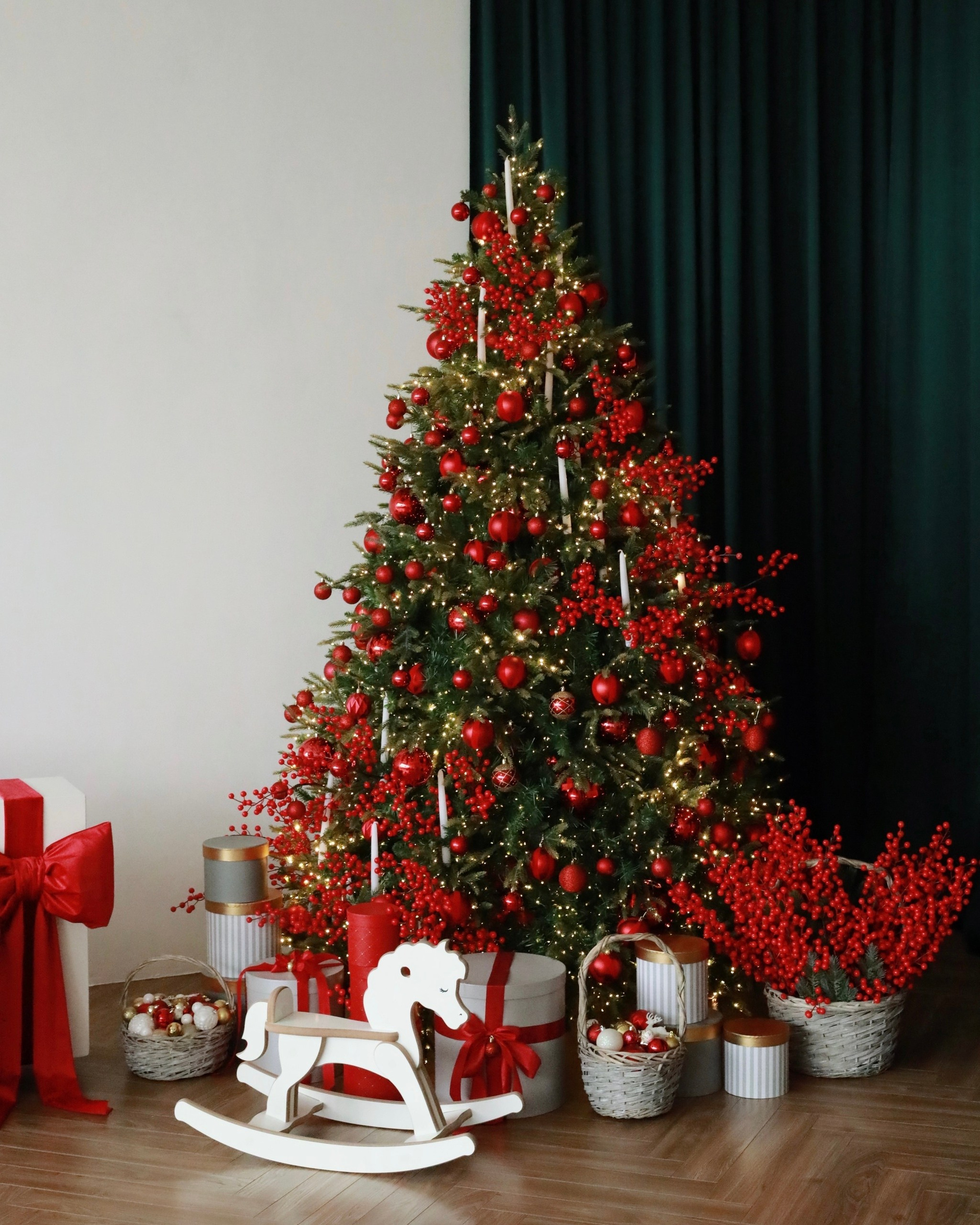 Стильный и насыщенный деталями новогодний зал! Пышная ель оформлена в богатой красной гамме: свечи, яркие ягоды и декоративные игрушки создают эффектный акцент. Объёмные кубы с бархатными лентами служат не только декором, но и удобными местами для позирования. Всё это расположено на фоне глубокого изумрудного шёлка, который добавляет съёмке изысканности и по-настоящему праздничной роскоши ✨
