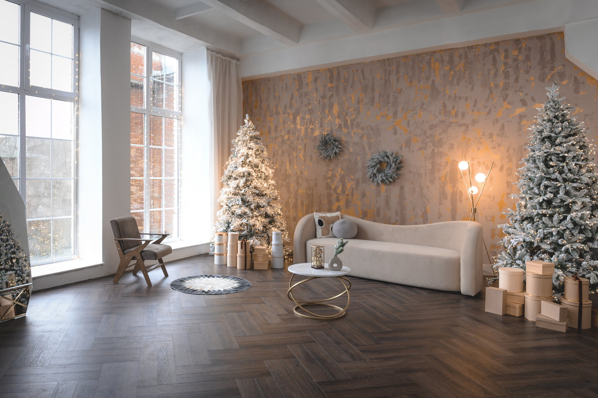 Напротив спальни — уютный бежевый диван, окружённый праздничным декором и двумя большими заснеженными ёлками.